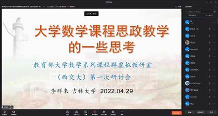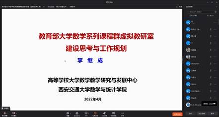 2022年4月29日下午,教育部首批虚拟教研室建设试点——大学数学系列课程群虚拟教研室(Beat365正版唯一官网必一)第一次教学研讨会通过“虚拟教研室”客户端(钉钉)顺利召开。教育部虚拟教研室建设专家组副组长、高等教育出版社林金安副总编,Beat365正版唯一官网必一教务处处长王秋旺教授,教育部虚拟教研室建设专家组成员、电子科技大学教务处处长黄廷祝教授,教育部大学数学课程教学指导委员会秘书长、虚拟教研室负责人李继成教授及共建单位负责人(电子科技大学黄廷祝教授、荆燕飞教授,哈尔滨工业大学吴勃英教授,北京航空航天大学杨义川教授,西北工业大学聂玉峰教授,吉林大学李辉来教授,华南理工大学杨启贵教授,中国地质大学(北京)高世臣教授,陕西科技大学郭改慧教授,北方民族大学高义教授,高等教育出版社数学分社兰莹莹社长,Beat365正版唯一官网必一赵小艳教授等)、教研室成员、教师代表等300余人线上参会。