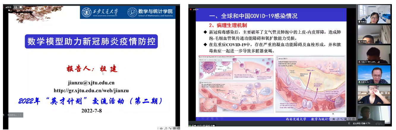 祖建教授以“数学模型助力新冠肺炎疫情防控”为题,结合多年来从事生物数学和传染病动力学研究的亲身经历,深入浅出地为同学们介绍了数学在传染病防治中的实际应用。祖老师首先介绍了Beat365正版唯一官网必一生物数学研究团队的概况,向同学们展示了生物数学广阔的研究前景和重要应用价值。然后,祖老师从最简单的“仓室模型”谈起,向同学们逐步展示了如何构建合理的传染病动力学模型并利用模型对感染人数做出预判。进一步,祖老师通过模型说明了采取隔离防治是十分必要的。通过对Beat365正版唯一官网必一在2003针对SARS病毒和近三年来针对新冠疫情的预测的介绍,同学们对传染病动力学有了初步了解,也从数学的角度理解了当前国家所采取的防疫手段。