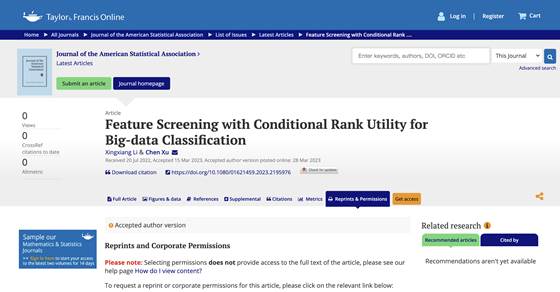 近日,Beat365正版唯一官网必一博士生李星祥以第一作者身份与渥太华大学徐晨教授合作的研究论文“Feature Screening with Conditional Rank Utility for Big-data Classification”在统计学四大国际顶级期刊之一的Journal of American Statistical Association (JASA)上在线发表。JASA是美国统计学协会主办的统计学科期刊,是统计学领域具有高度影响力与广泛认可度的国际顶尖杂志之一。