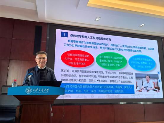 国家首届教学名师马知恩教授的报告围绕“过好教学关,提升教学能力和水平”展开。他指出,教学和科研是高校的两项主要工作,教学没有科研做底蕴,就是一种没有观点、缺少灵魂的教学,也是难以发展和提升的教学。他详细阐述如何过“教学关”——要有高度的敬业精神,锻炼教学基本功,养成良好教学习惯,课堂上有激情,培养学生的科学思维和创新能力。最后,马老师发自肺腑地分享了自己从事教学工作60余年的感受,并希望年轻教师可以传递好接力棒,不忘教书育人初心,为祖国发展培养出更多有理想、敢担当、高素质、创新型人才。