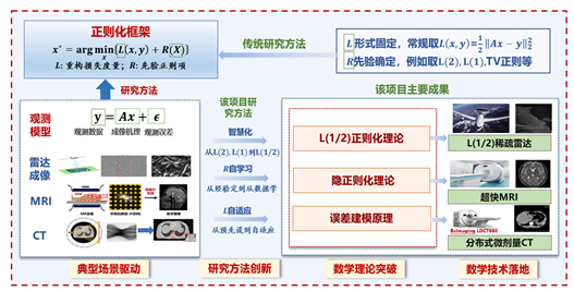 在徐宗本院士的带领下,团队针对弱观测成像反问题,历经十余年探索,采取“典型场景驱动、机理-数据融合”思路,解决了这一难题,发展出了一套解反问题的L(1/2)正则化理论与自适应正则化方法,进而形成了突破雷达、CT、磁共振成像等领域技术瓶颈的全新数学技术,落地应用产生重大价值。
