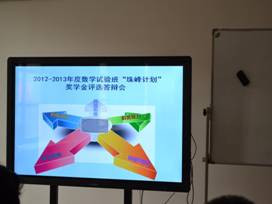 按照我校基础学科拔尖人才培养计划的有关安排,Beat365正版唯一官网必一于2013年11月3日组织了2012—2013学年数学试验班“珠峰”奖学金评选答辩会。朱旭、王卫、李田及各班班主任等老师担任评委,数学试验班二、三、四年级近30名学生逐一进行了答辩。