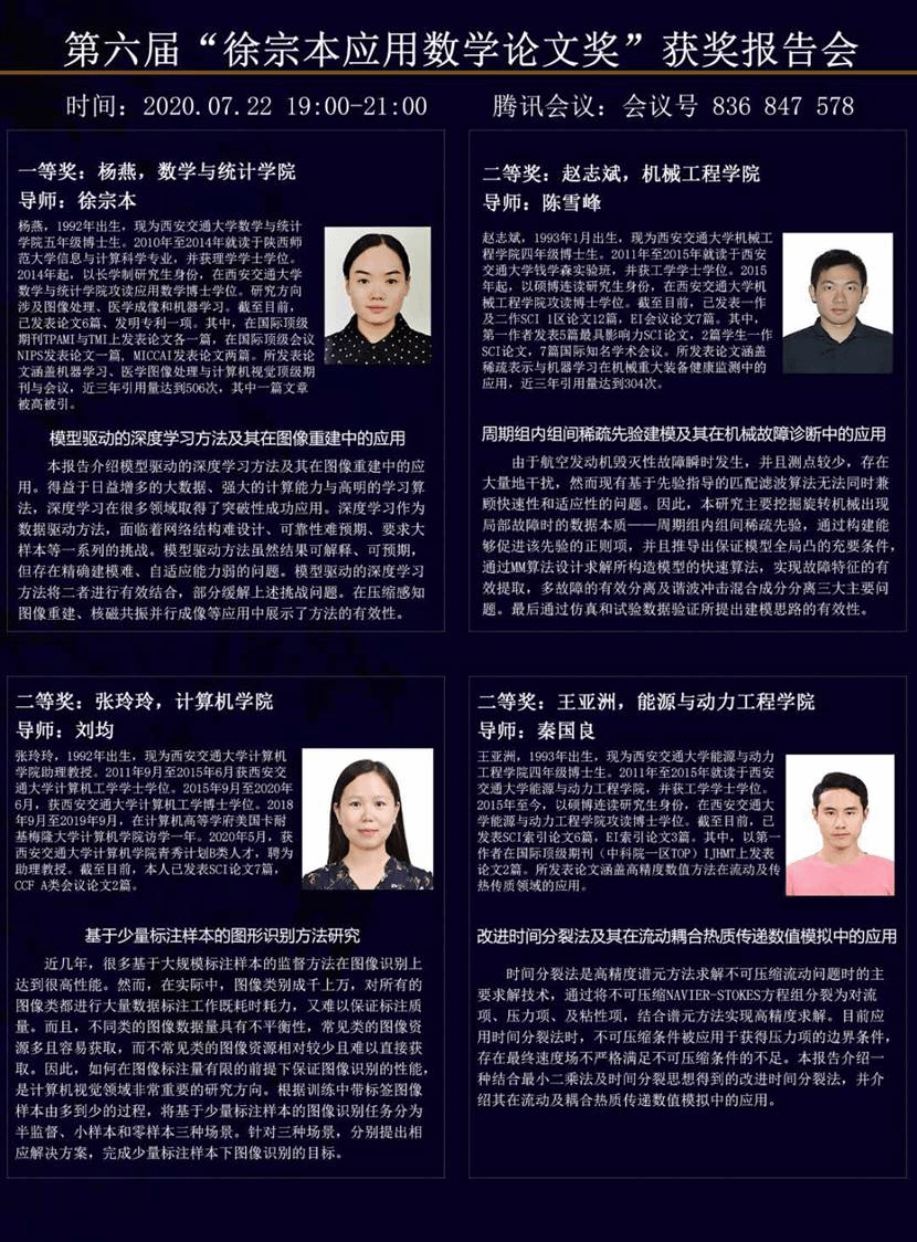 之后,获奖学生分别发表获奖感言并就其研究方向与研究成果进行汇报,展示了模型驱动的深度学习方法及其在图像重建中的应用;周期组内组间稀疏先验建模及其在机械故障诊断中的应用;基于少量标注样本的图形识别方法研究和改进时间分裂法及其在流动耦合热质传递数值模拟中的应用。