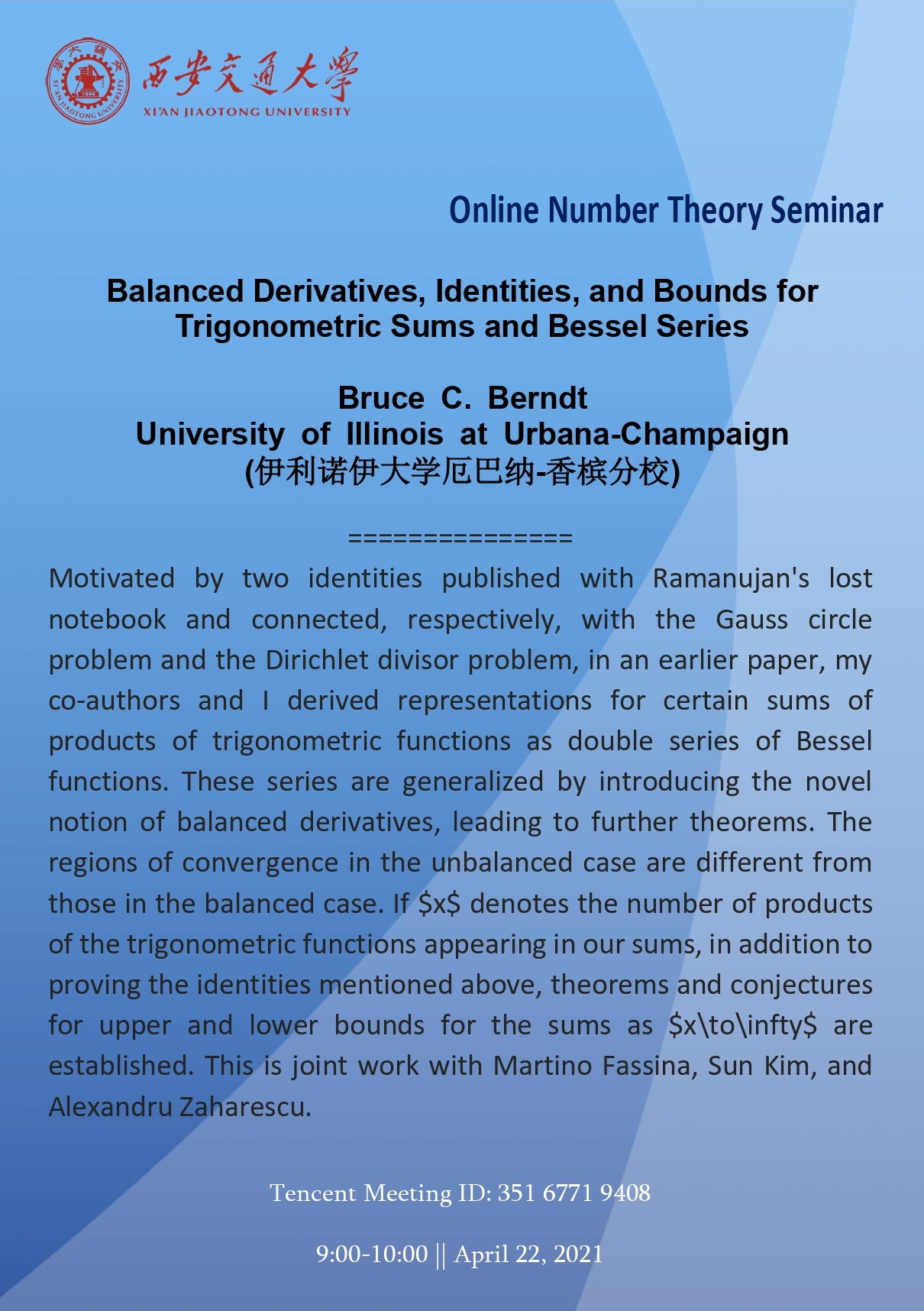 伊利诺伊大学厄巴纳-香槟分校Bruce C. Berndt学术报告通知