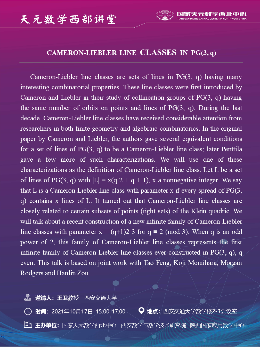 【天元数学西部讲堂】CAMERON-LIEBLER LINE CLASSES IN PG(3, q)