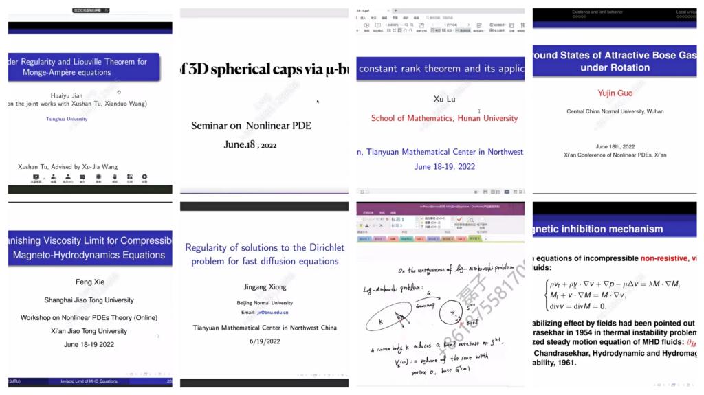 随后,会议进入报告环节。北京大学史宇光教授,清华大学简怀玉教授,浙江大学李奇睿研究员、上海交通大学谢峰教授等18位活跃在偏微分方程领域的一线专家做了精彩的学术报告。他们分享了各自在如流体、几何、随机、优化、控制与计算等偏微分方程理论与应用研究前沿领域的最新科研进展和研究心得。北京大学史宇光教授,清华大学简怀玉教授,上海交通大学楼元教授和李从明教授,中国科学技术大学麻希南教授等知名专家同与会学者共同探讨了领域中的重大科学问题及解决方法,启发思想、畅谈实践。