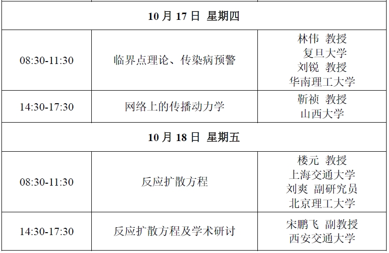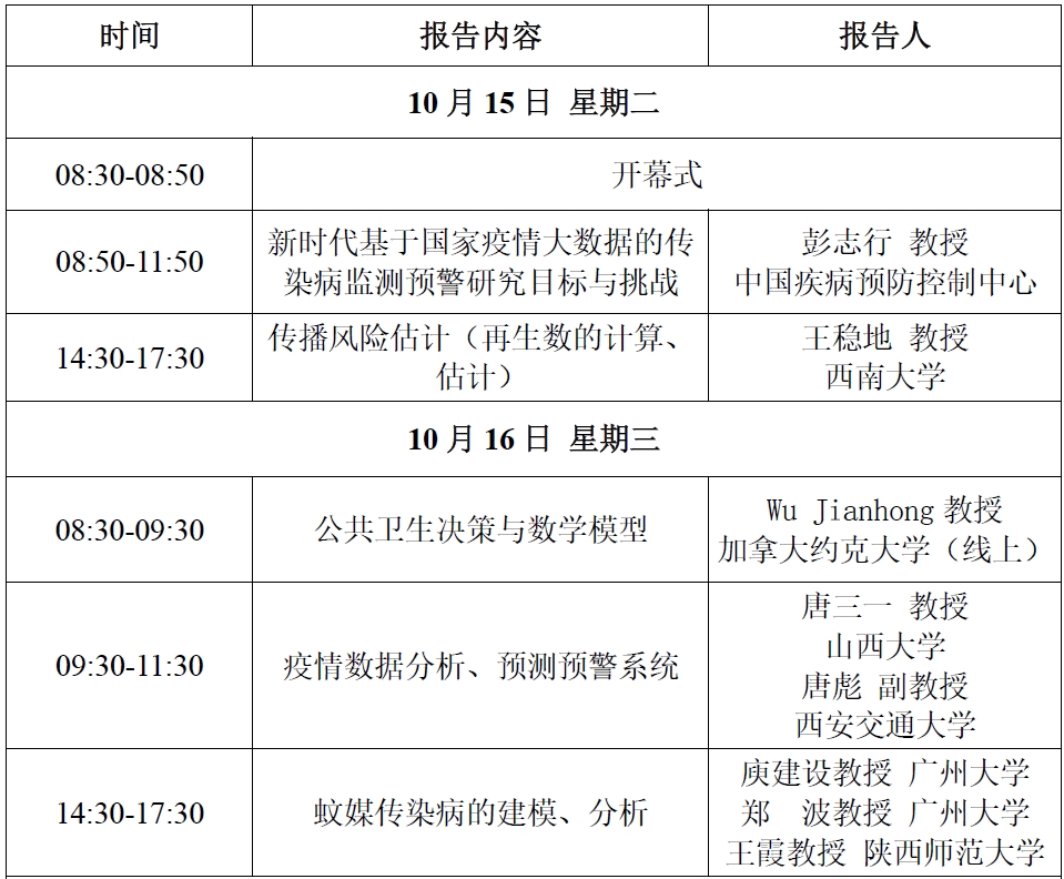 研讨班将围绕重大传染病疫情防控、决策机制评估的核心问题,研讨应用数学在公共卫生领域(主要是新发重大传染病)发挥的作用、公共卫生的热点问题探讨、传染病传播风险估计、传染病的预测预警、时空异质性的数学刻画及其对动力学性态的影响;探讨虫/蚊媒传染病的防控和季节性对演化趋势的影响,探讨如何基于多源数据辨识有时空异质性的动力学模型、参数估计以及预测预警平台建立等,实现传染病的精准预测和长效防控。