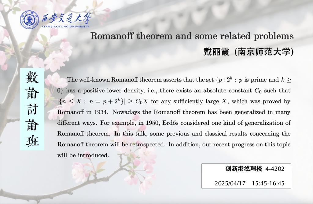 戴丽霞,南京师范大学教授,博士生导师,美国数学评论评论员,主要从事解析数论和组合数论方面的研究,在表示函数方面得到了深刻的结果。主持完成多项国家级和省部级科研项目,在国内外著名数学杂志发表学术论文 30 余篇。