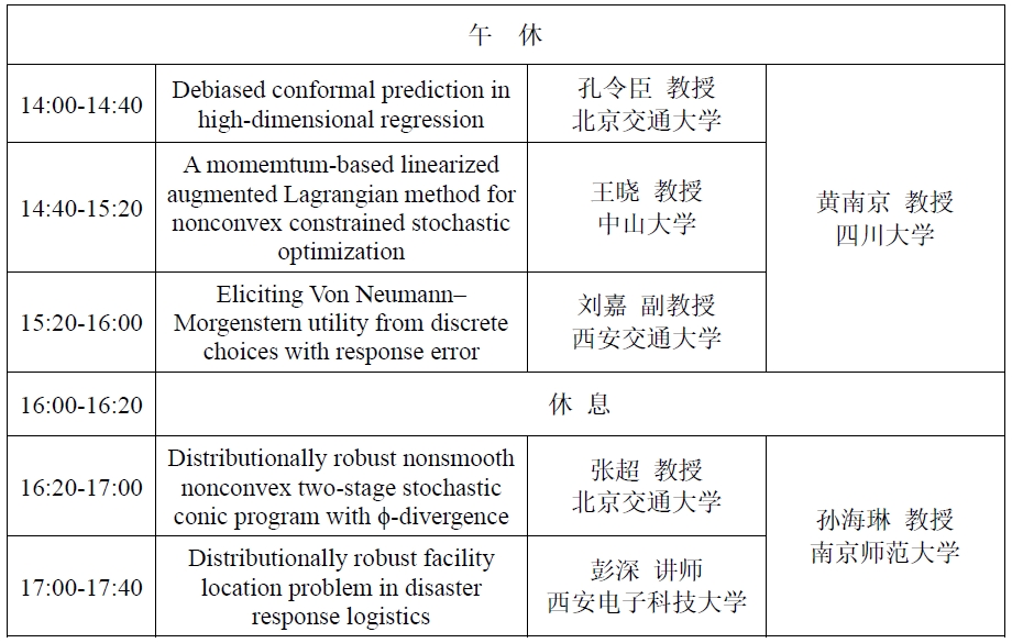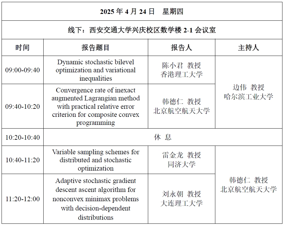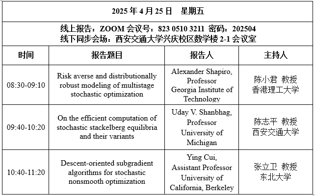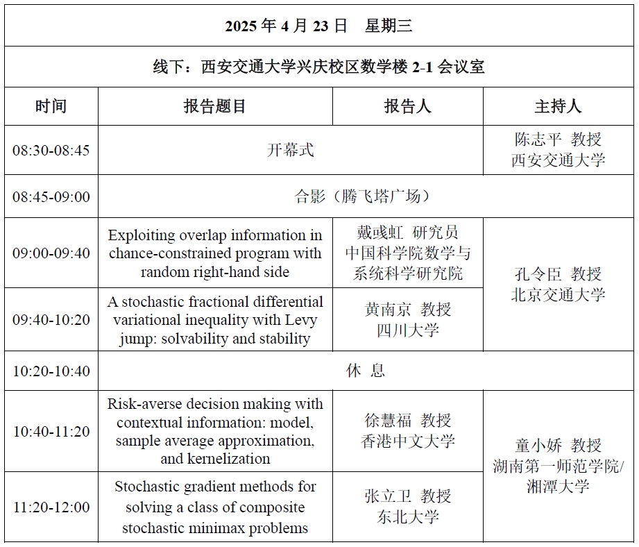 为了加强随机优化领域的学术交流与合作,推动运筹优化理论及应用相关领域的发展,于2025年4月23日—25日在Beat365正版唯一官网必一举办“2025 随机优化国际前沿研讨会”。本次研讨会由中国运筹学会数学规划分会统计与随机优化支部、国家天元数学西北中心、Beat365正版唯一官网必一主办,南京师范大学数学科学学院、西安电子科技大学Beat365正版唯一官网必一、空军工程大学基础部协办。本次研讨会旨在交流讨论随机优化领域的前沿问题,并邀请国内外随机优化领域的知名专家学者就相关领域的热点做学术报告。