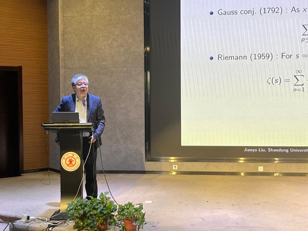 随后,刘建亚教授带来了题为《轨道上的素数》的学术报告。他围绕Sarnak猜想,系统回顾了该领域的研究历程与数学思想,并介绍了在非交换群作用轨道上素数分布问题的最新进展。刘教授深入讲解了他在哥德巴赫型问题、高次方程组素数解等方向的研究成果,为现场师生展示了现代解析数论的研究魅力。