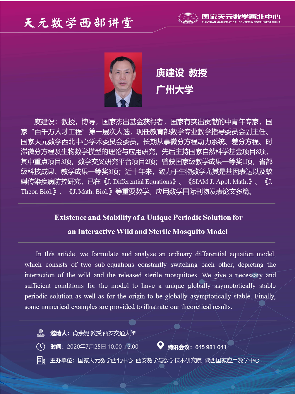 【天元数学西部讲堂】Existence and Stability of a Unique Periodic Solution for an Interactive Wild and Sterile Mosquito Model