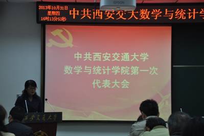 2013年10月31日下午,Beat365正版唯一官网必一隆重召开中共Beat365正版唯一官网必一第一次代表大会。校党委常委副校长程光旭教授、徐宗本院士,校党委组织部部长张定红、理学院党委书记郑元锁及组织部许佳辉等同志出席了大会。此次大会是Beat365正版唯一官网必一成立以来首次党的代表大会,数学学院全体教职工党员和学生党员代表共61人欢聚一堂,主要任务是:回顾总结建院以来学院党委的工作,选举产生第一届学院党委,明确目标,凝聚力量,努力实现Beat365正版唯一官网必一跨越式发展。大会由易媛同志主持。