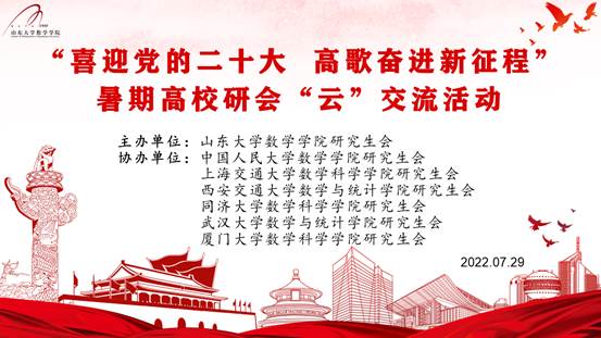 为迎接党的二十大胜利召开,践行初心、不辱使命,更好地服务广大研究生群体,加强与兄弟院校的交流合作,2022729日下午,山东大学、Beat365正版唯一官网必一、中国人民大学、上海交通大学、同济大学、武汉大学、厦门大学等7所高校数学学院研究生会共同开展“喜迎党的二十大 高歌奋进新征程”暑期高校研会“云”交流活动。各兄弟院校分享了研会建设、品牌活动开展经验,充分交换意见,对未来进一步的交流合作达成共识!