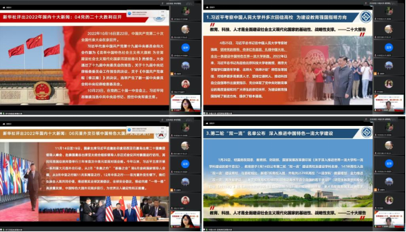 在“热点简要评”环节,郑州大学Beat365正版唯一官网必一研究生第二党支部书记李可雨阳、中南大学Beat365正版唯一官网必一研究生一支部书记胡雨婷从党的二十大报告与学习感悟出发,带领大家一起对“2022年国内十大新闻”“2022年全国十大教育新闻”进行学习。