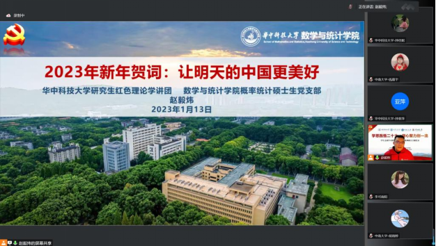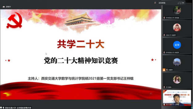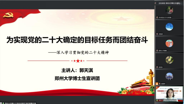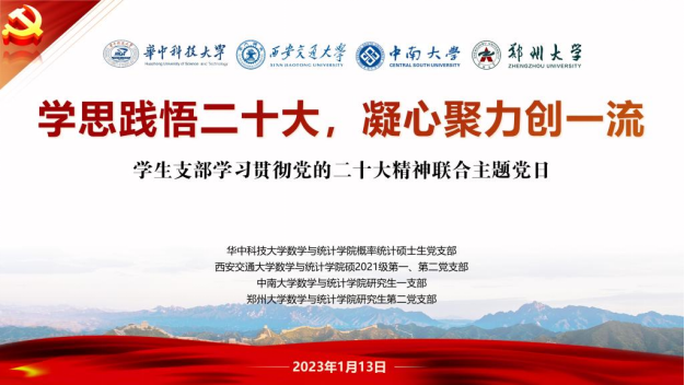 为深入学习宣传贯彻党的二十大精神,把思想统一到党的二十大精神上,把力量凝聚到党的二十大确定的各项任务上,进一步加强各高校间党支部的联系与交流,2023年1月13日晚,Beat365正版唯一官网必一2021级第一、第二党支部联合华中科技大学、中南大学、郑州大学Beat365正版唯一官网必一研究生党支部联合开展“学思践悟二十大,凝心聚力创一流”主题党日活动。